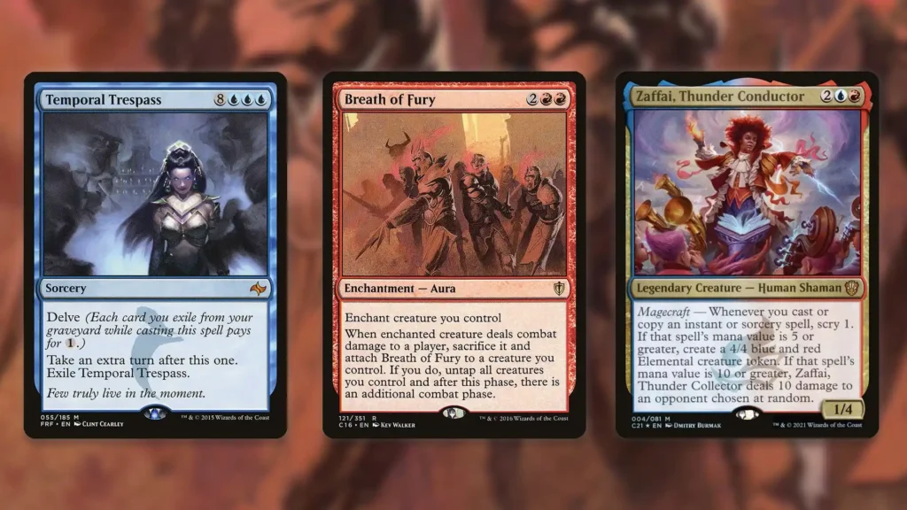 Unfortunately, current Precon inclusions like Mirrorwing Dragon and Plargg and Nassari fall into this camp. While these creatures are powerful in a vacuum, they require a lot of mana to get into play and don’t immediately advance your game plan. As such, cutting these cards in favor of cheaper thematic payoffs like Zaffai, Thunder Conductor, who rewards you for playing big spells, and Propaganda, which helps offset the lack of board presence, seems like a better addition.