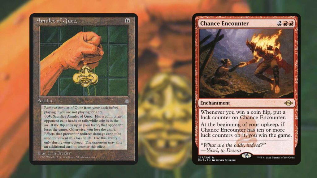 If you want to bet your entire Commander game on a literal coinflip, these two MTG cards let you do that. Amulet of Quoz will only end the game for one player, but Chance Encounter will win you the game if you can win ten coin flips while it’s in play.
